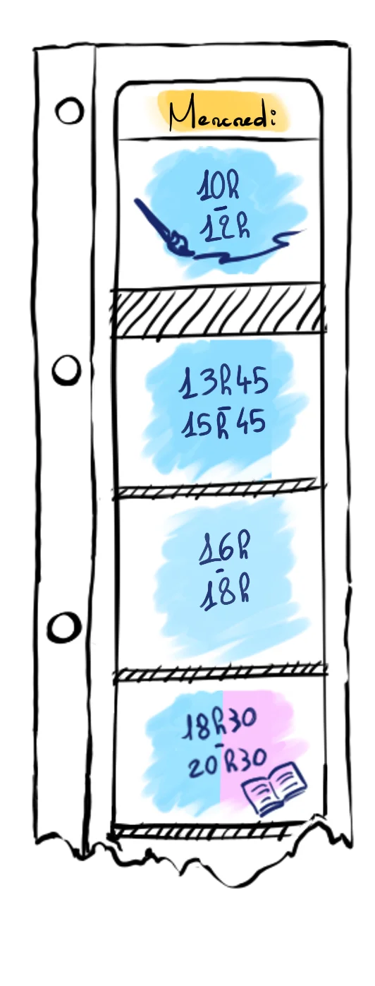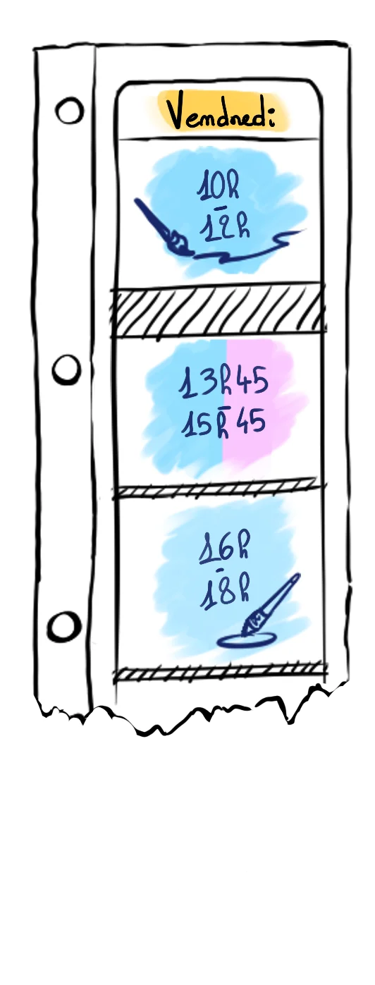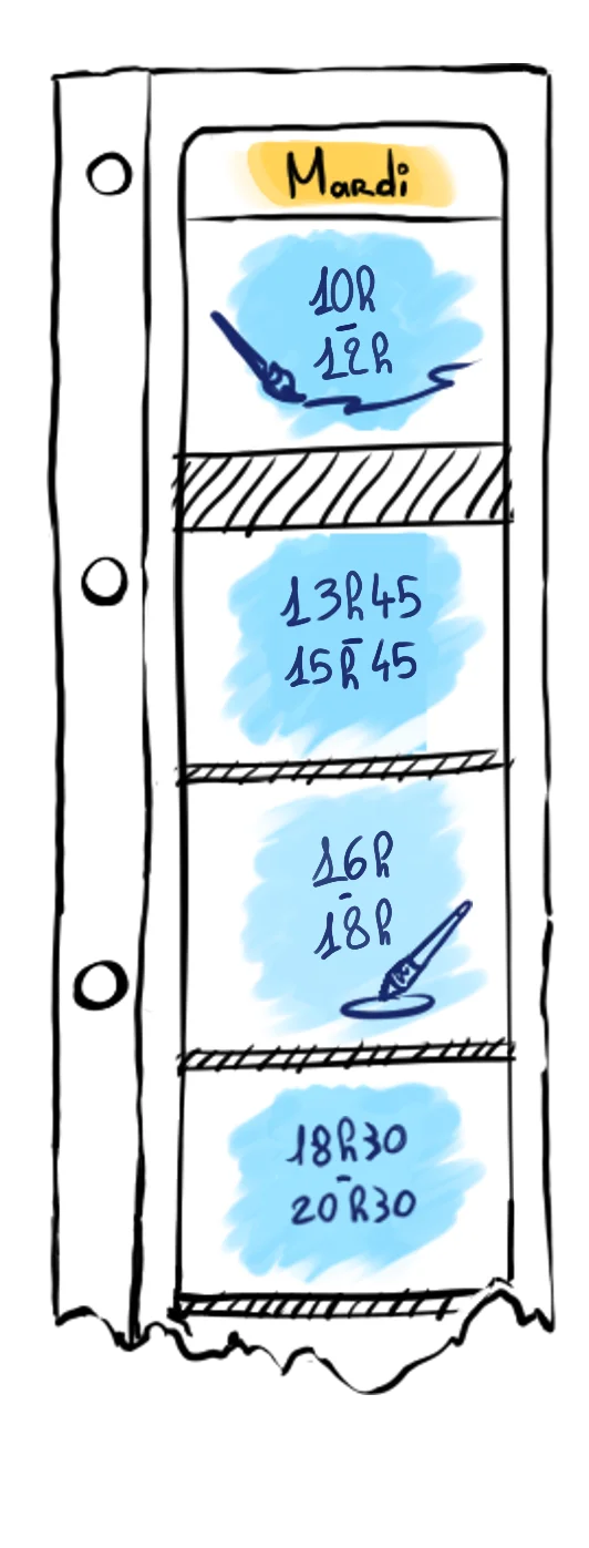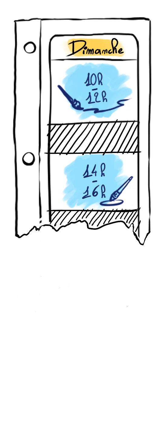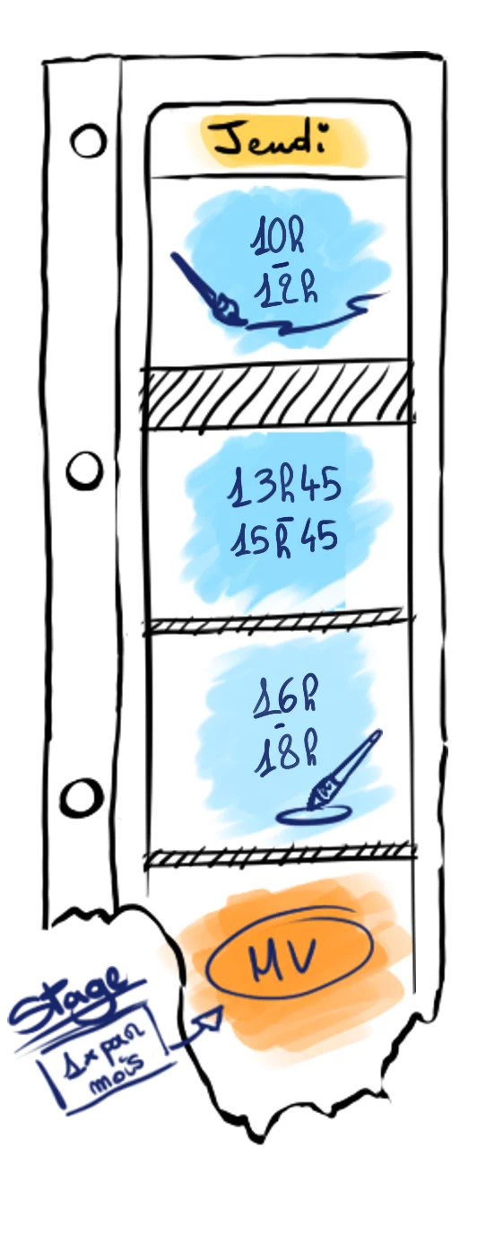 Vous pouvez placer vos cours quand vous le souhaitez dans les horaires d’ouverture. En plus des cours d’arts visuels (dessin, peinture, digital painting, etc.) vous pouvez aussi assister à des cours d’écriture les mercredis et vendredis. Un jeudi par mois, nous organisons un cours du soir de modèle vivant (30€/séance).